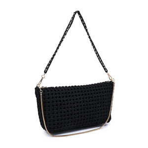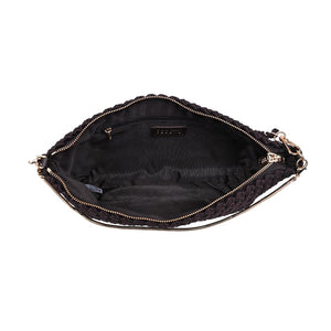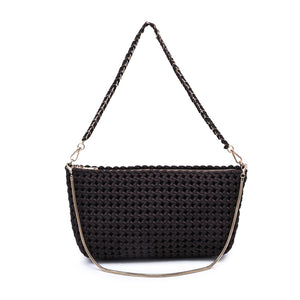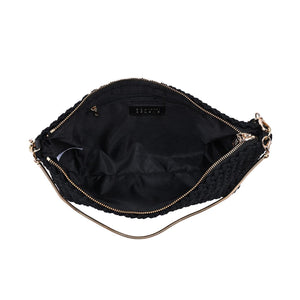 Eclipse Clutch — woven crescent silhouette with a sleek zip top and slim chain strap. Lightweight, structured shape holds phone, wallet, keys, and essentials. Textured exterior adds modern edge to tailored workwear, weekend plans, and after-hours drinks. Hands-free or handheld, minimalist interior keeps things neat. Stylish, versatile, travel-ready — a go-to clutch for women who want function without fuss.