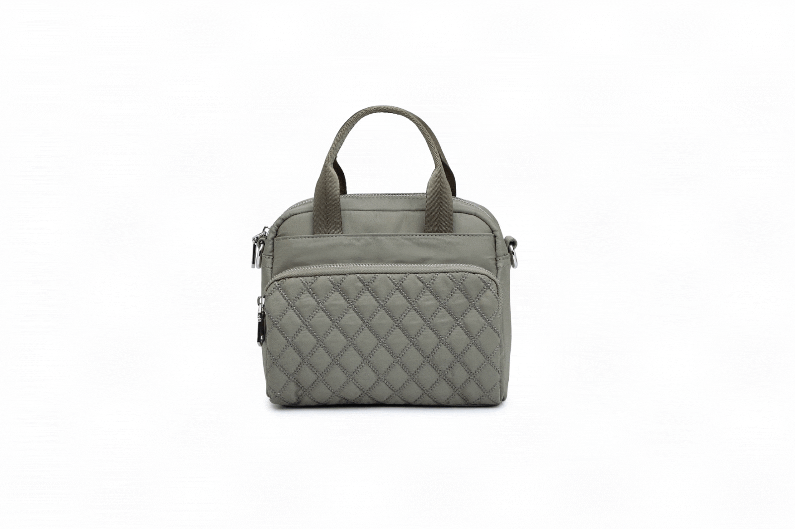 - Exterior Details: Quilted front panel, top handles, detachable + adjustable strap